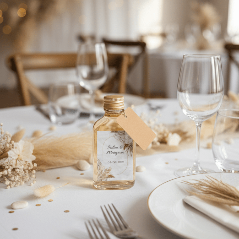En plus d'être un cadeau, ces bouteilles deviennent un élément central de votre scénographie. Elles s'adaptent à tous les thèmes : mariage vintage, champêtre, moderne ou industriel. Posées sur une nappe en lin ou disposées dans un coffret en bois à l'entrée de la salle, elles garantissent un effet "waouh".